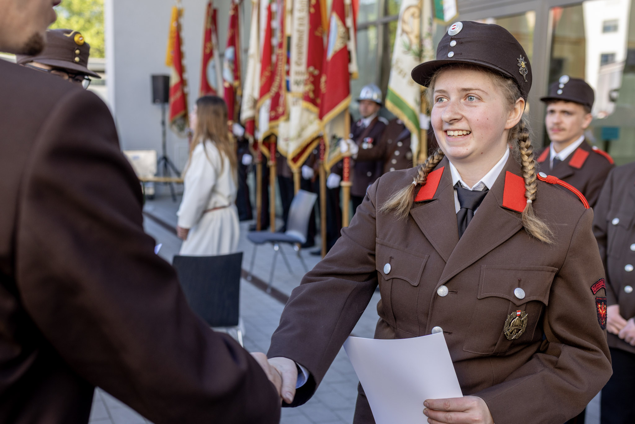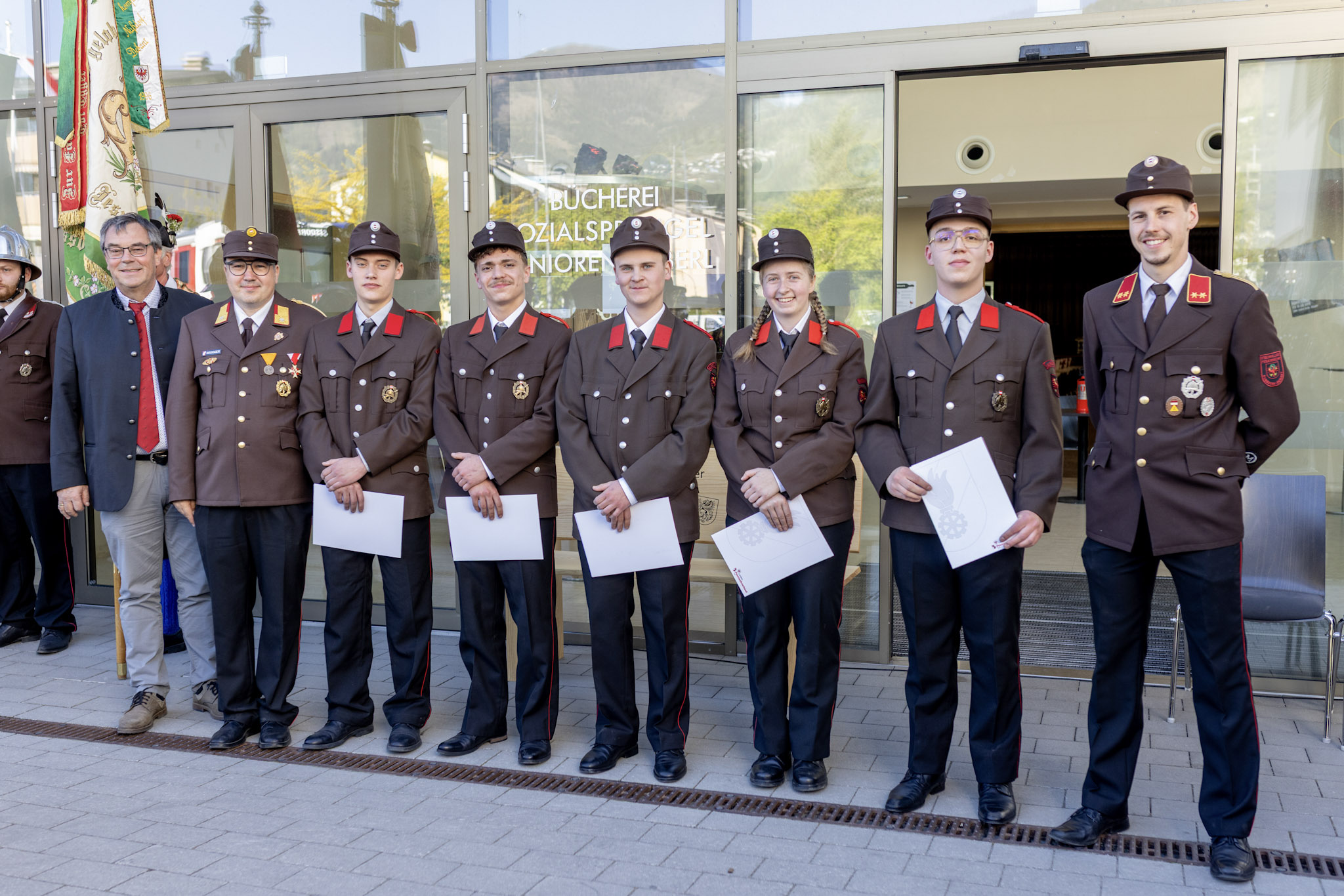 Nach den Reden des Bürgermeisters und des Kommandanten folgte die Angelobung der neuen Mitglieder: Annika Senfter, Dominik Mayr, Moritz Kögler, Silvio Horvat und Valentin Zanier wurden angelobt und zum Feuerwehrmann bzw. zur Feuerwehrfrau befördert.