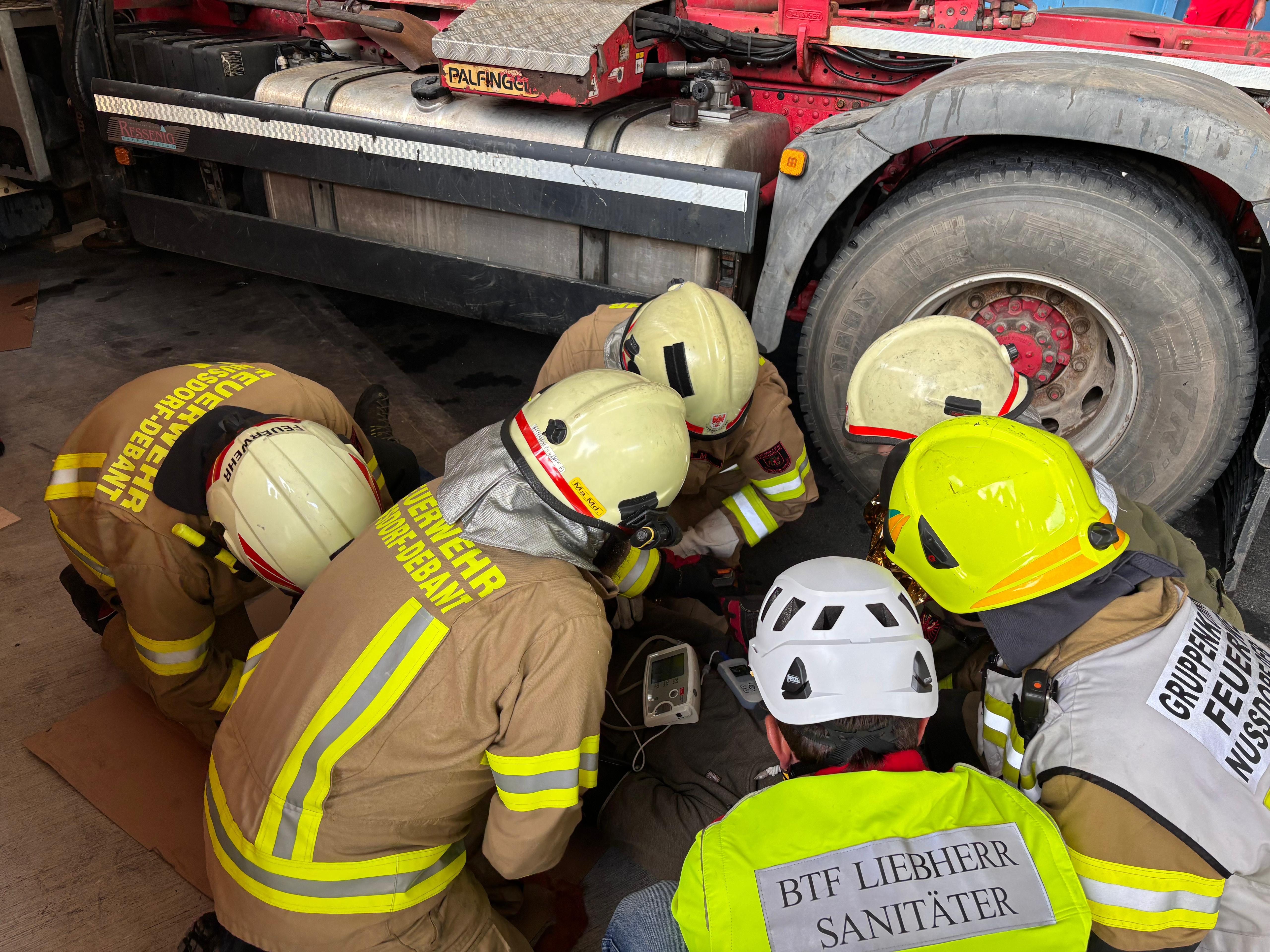 Im ersten Szenario beübten die Feuerwehr Nußdorf-Debant, Teile der Betriebsfeuerwehr Liebherr und der Sanitätszug die Rettung mehrerer verletzter Personen nach einem simulierten LKW-Unfall.