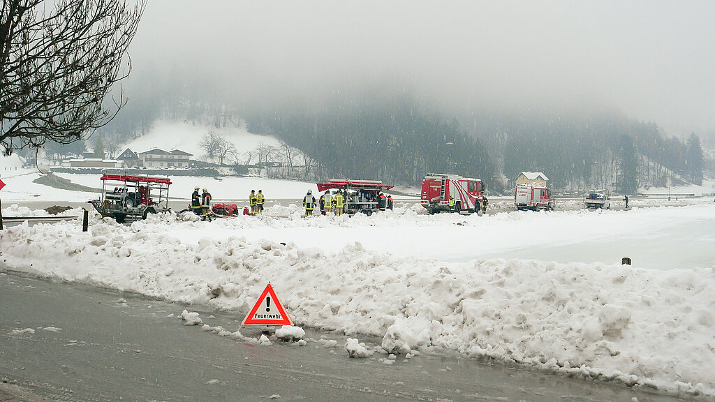 Durch die Schnee- und Starkregenfälle staute sich das von den Hängen des Nußdorfer Berges abrinnende Wasser in den sogenannten „Böden“ im Mitterweg derart auf, dass eine Überflutung in das angrenzende Siedlungsgebiet drohte.